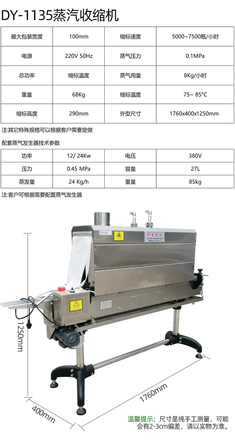 - 安全防護措施完善:為了確保操作人員的安全,蒸汽收縮機通常配備了多種安全防護裝置。如溫度過高自動報警和停機裝置,當蒸汽發生器的溫度超過安全限制時,機器會自動發出警報并停止工作,防止發生安全事故。還有防護欄和緊急停止按鈕,防護欄可以防止操作人員接觸到高溫的蒸汽部件,緊急停止按鈕則在突發情況下(如產品卡住、冒煙等)能讓機器立即停止運行