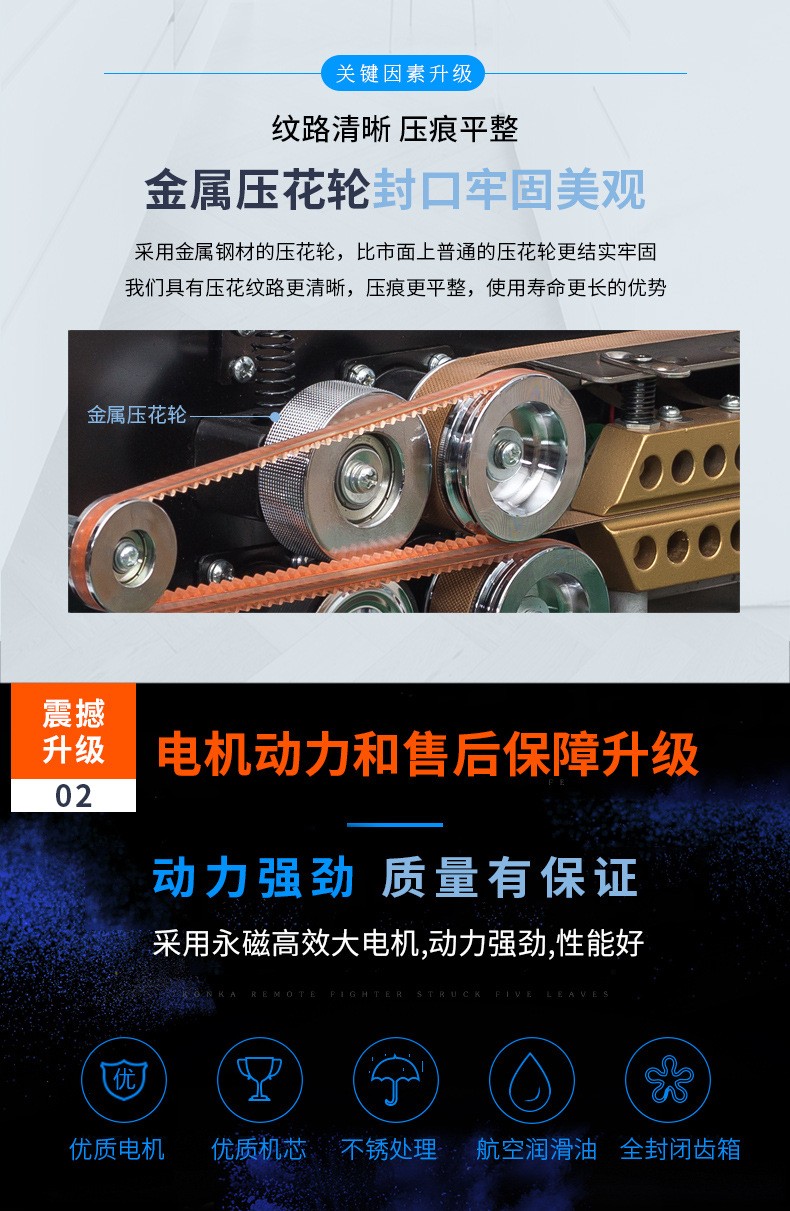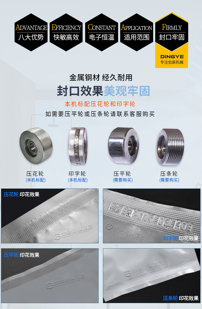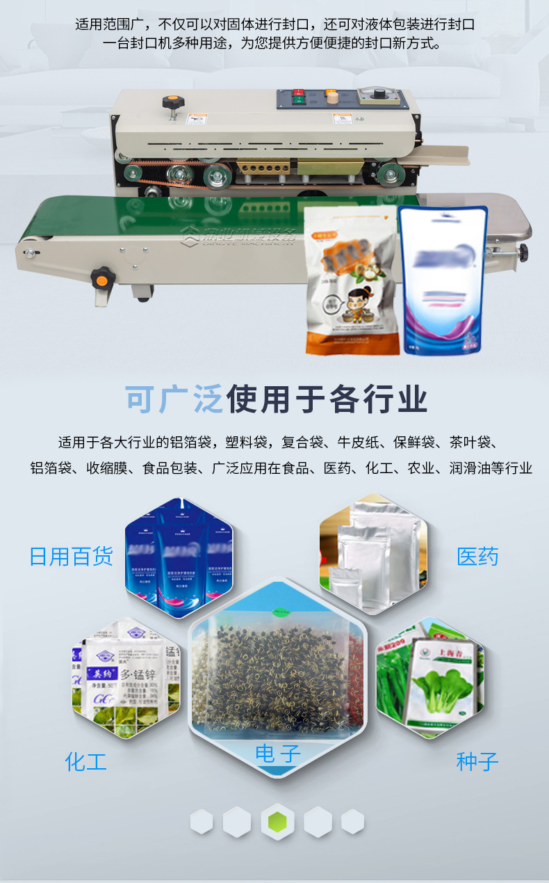 - 針對鋁箔材料或者鋁箔復合包裝材料設計。鋁箔具有良好的阻隔性,能有效防止氧氣、水分等進入包裝內(nèi)部。這種封口機可以確保鋁箔包裝的密封性,常用于食品、藥品、保健品等行業(yè),如藥品的鋁箔泡罩包裝的封口。