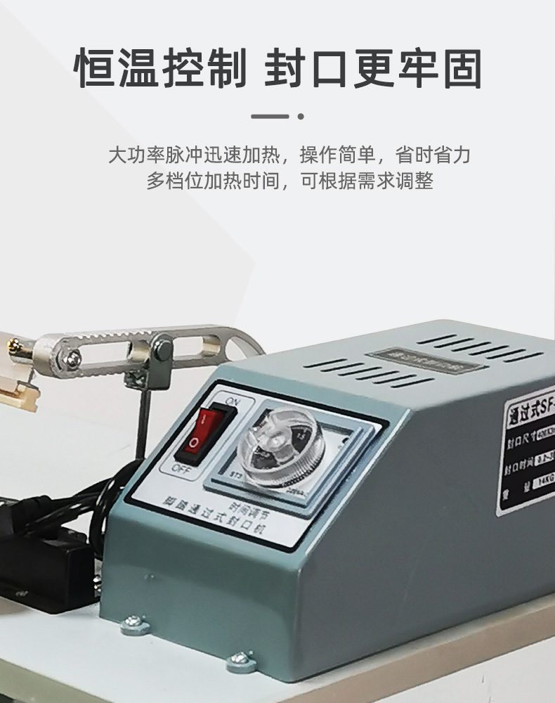 • 高速度生產:如果生產線上要求通過式封口機每分鐘封口數量較多,如達到 50 - 100 袋甚至更多,為了在短時間內完成封口操作,就需要選擇功率較大的設備,一般在 1000W 以上,以保證快速加熱和冷卻,滿足生產節奏。