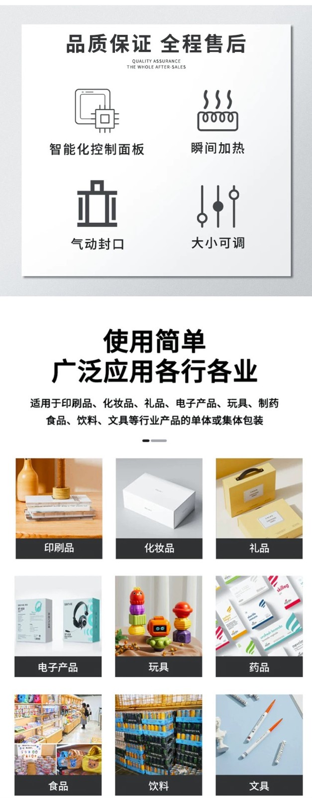 - 產品尺寸和形狀:產品的尺寸和形狀決定了設備的適用范圍。對于尺寸較大或形狀不規則的產品,需要選擇具有較大封口尺寸和靈活調整功能的設備,以確保能夠完全包裹和密封產品。