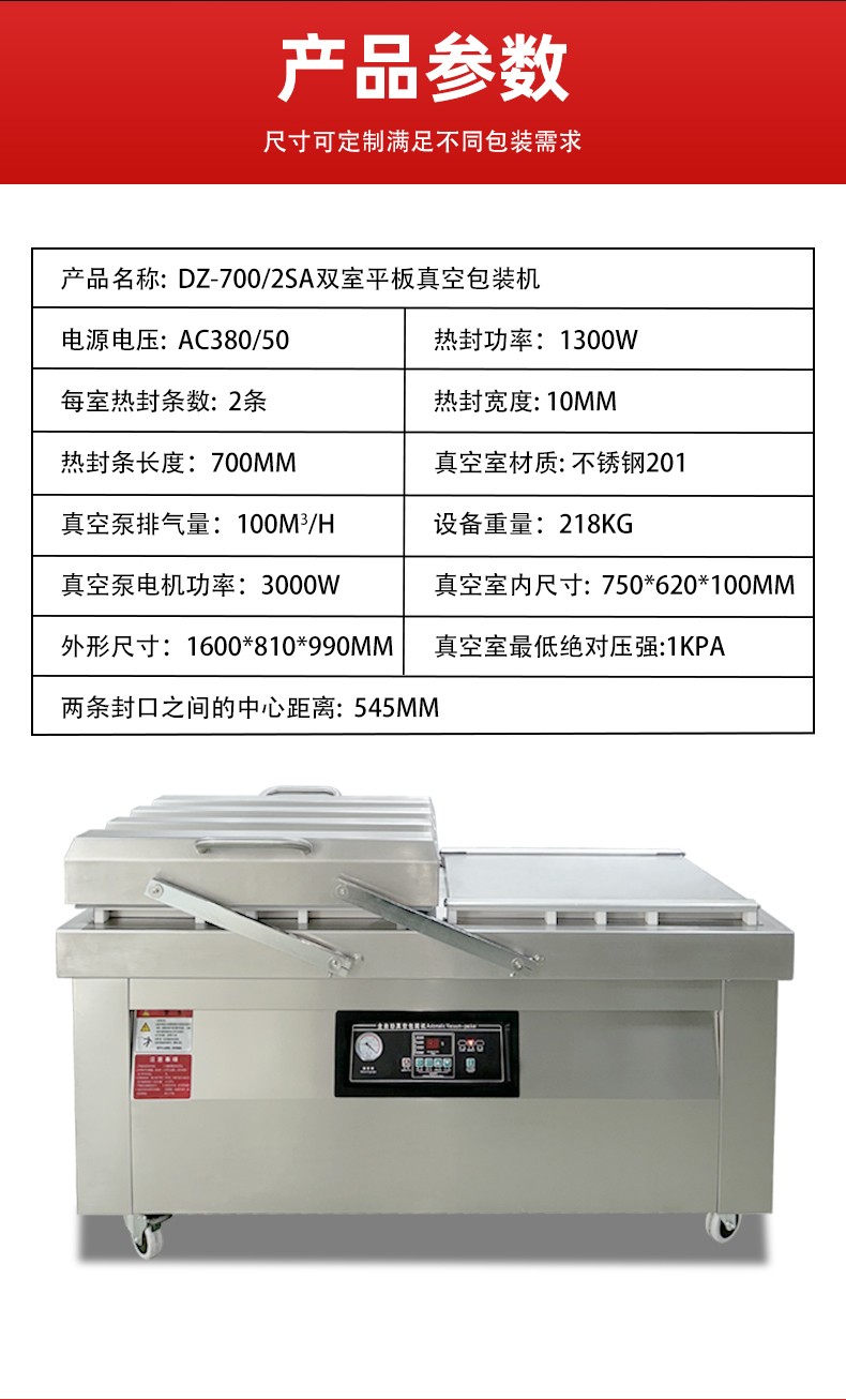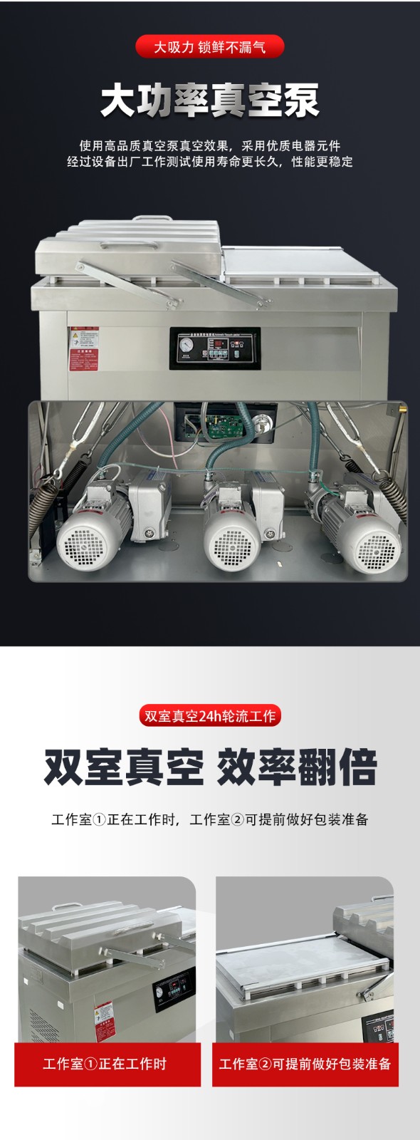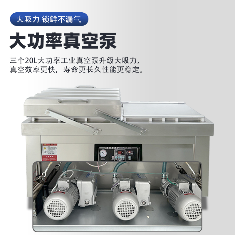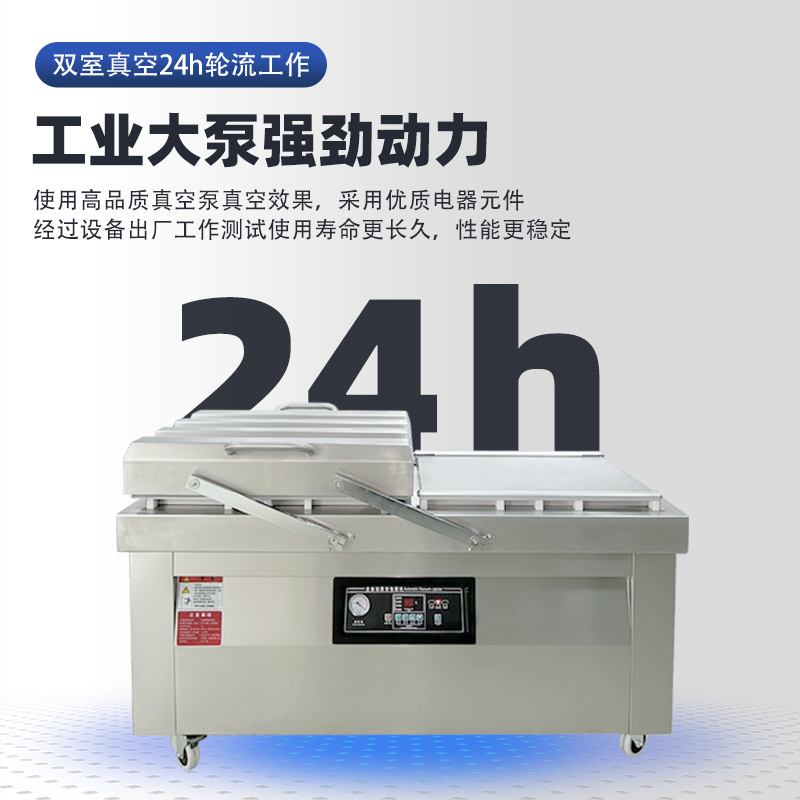 通過這種 “交替作業” 模式,雙室機無需等待單個室的完整流程結束即可開始下一批包裝,效率比單室機提升 60%-100%,同時雙泵 + 雙室獨立密封的設計,也保障了每一批次物料的真空度與密封性穩定。