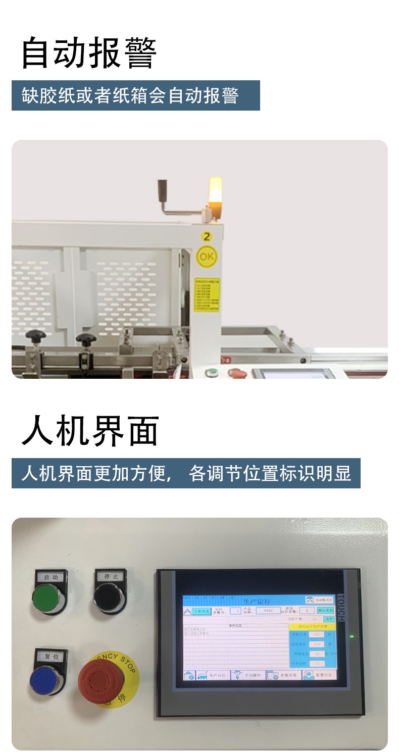 設備通過 PLC 程序精準控制每一步動作(如吸箱力度、折邊角度、膠帶粘貼壓力),確保所有紙箱的
