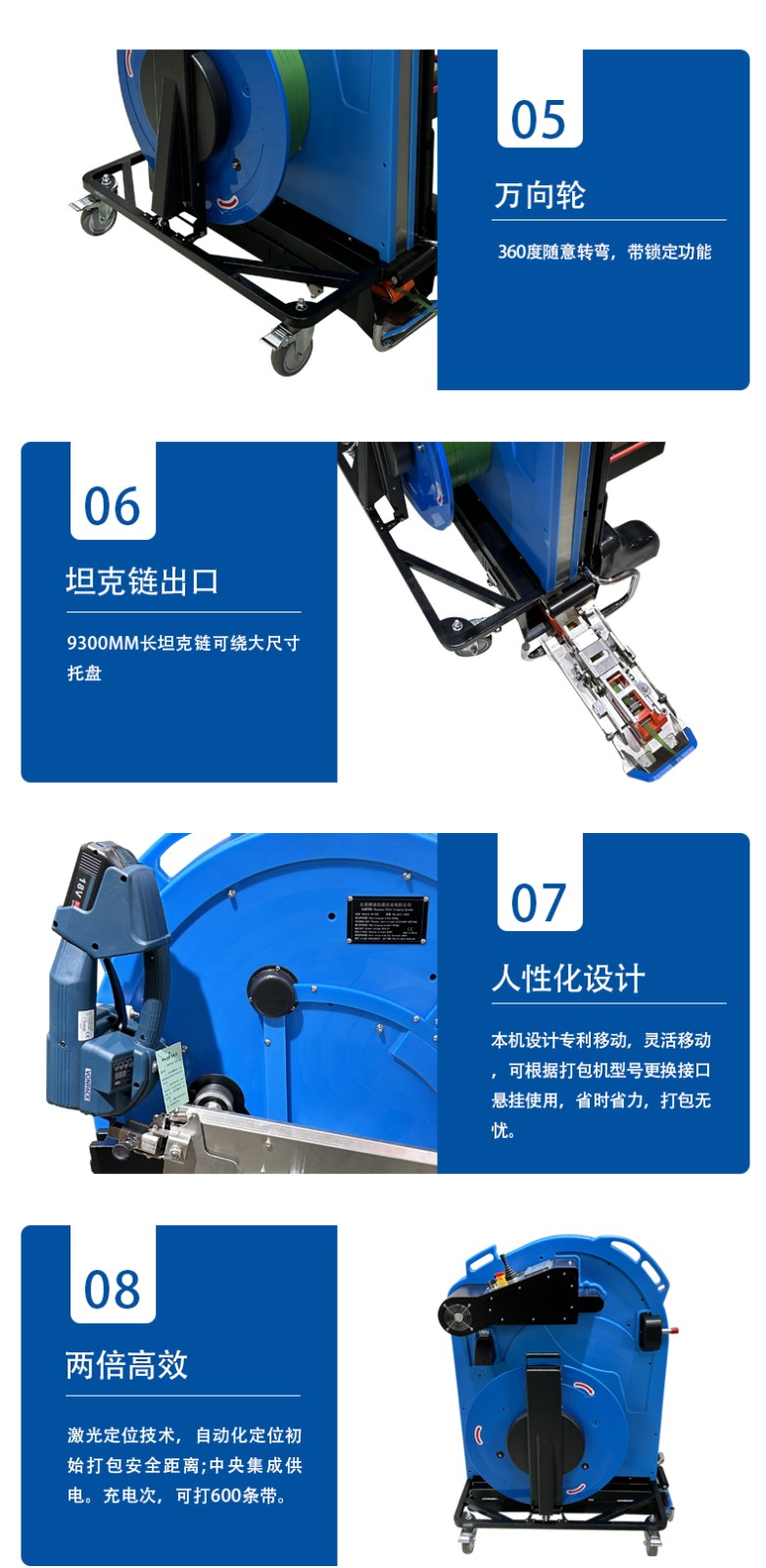 - 自動切斷與復位:粘合完成后,切刀機構精準切斷帶子,同時送帶機構自動將下一段帶子送至待穿位置,完成一個循環,等待下一批貨物。