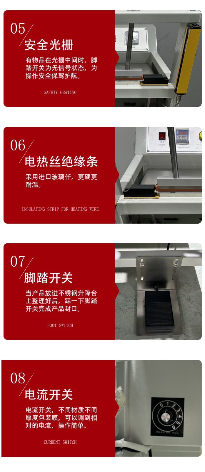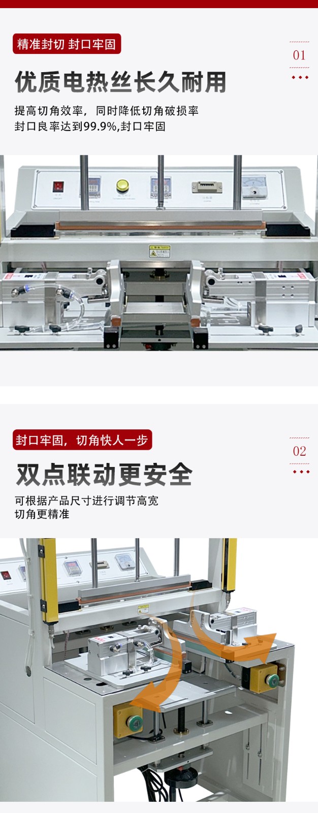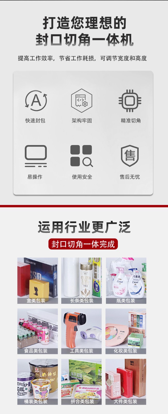 高效快捷:封口速度比傳統設備快,部分機型每分鐘可完成 50 次精準封口,能有效提高生產效率。 操作簡便:通常采用一鍵啟動或腳踏開關控制,操作人員只需簡單培訓即可上手操作。 封口質量好:采用雙面加熱封口,壓合平整美觀,封口牢固,且封口長度、寬度等參數可根據需求調整。 適應性強:可適用于 PVC、PP、POF 等多種材質的收縮膜,還能根據不同產品規格進行調整,兼容多種尺寸的包裝材料。 安全性高:部分機型配備急停按鈕等安全裝置,且外觀設計圓潤,無棱角,可減少操作人員受傷的風險。 應用場景 廣泛應用于食品、化工、電子、醫藥、日化等行業,可用于對各種產品的包裝材料進行封口和切角處理,如食品包裝袋、日化用品包裝袋、電子產品包裝盒等的封裝。 代表產品 如中堡智能科技實業有限公司的HX-4018 智能氣動封口切角機、東莞博冠包裝實業有限公司的氣動封口切角機等,均具有運行穩定、包裝速度快、多規格適配等特點。
