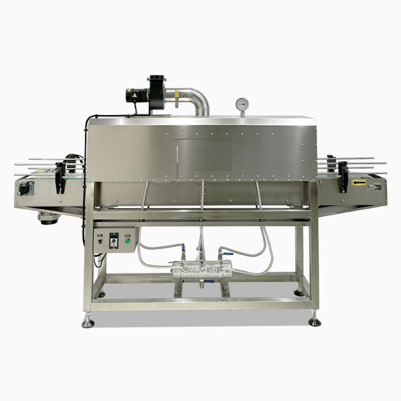- 帶有封閉薄膜的產品被輸送帶送入蒸汽收縮通道。
