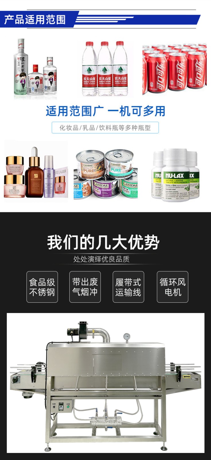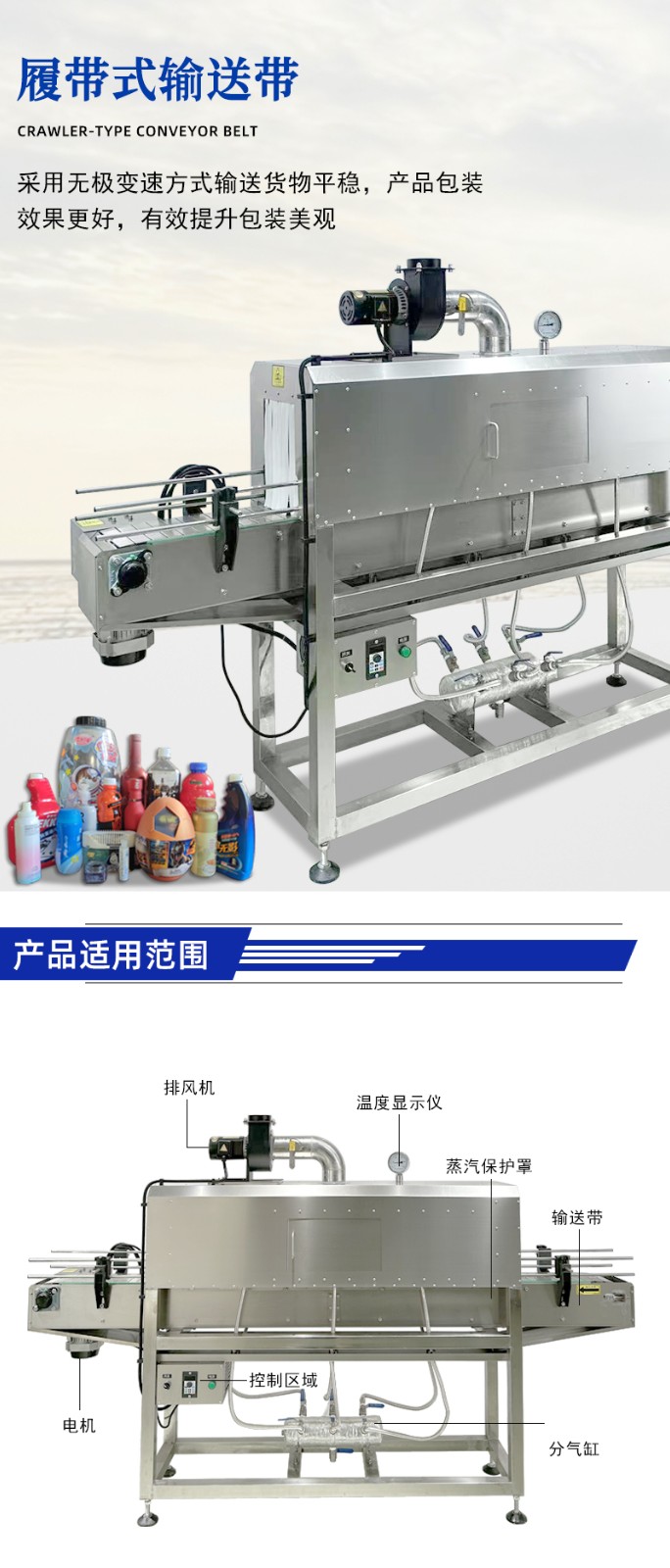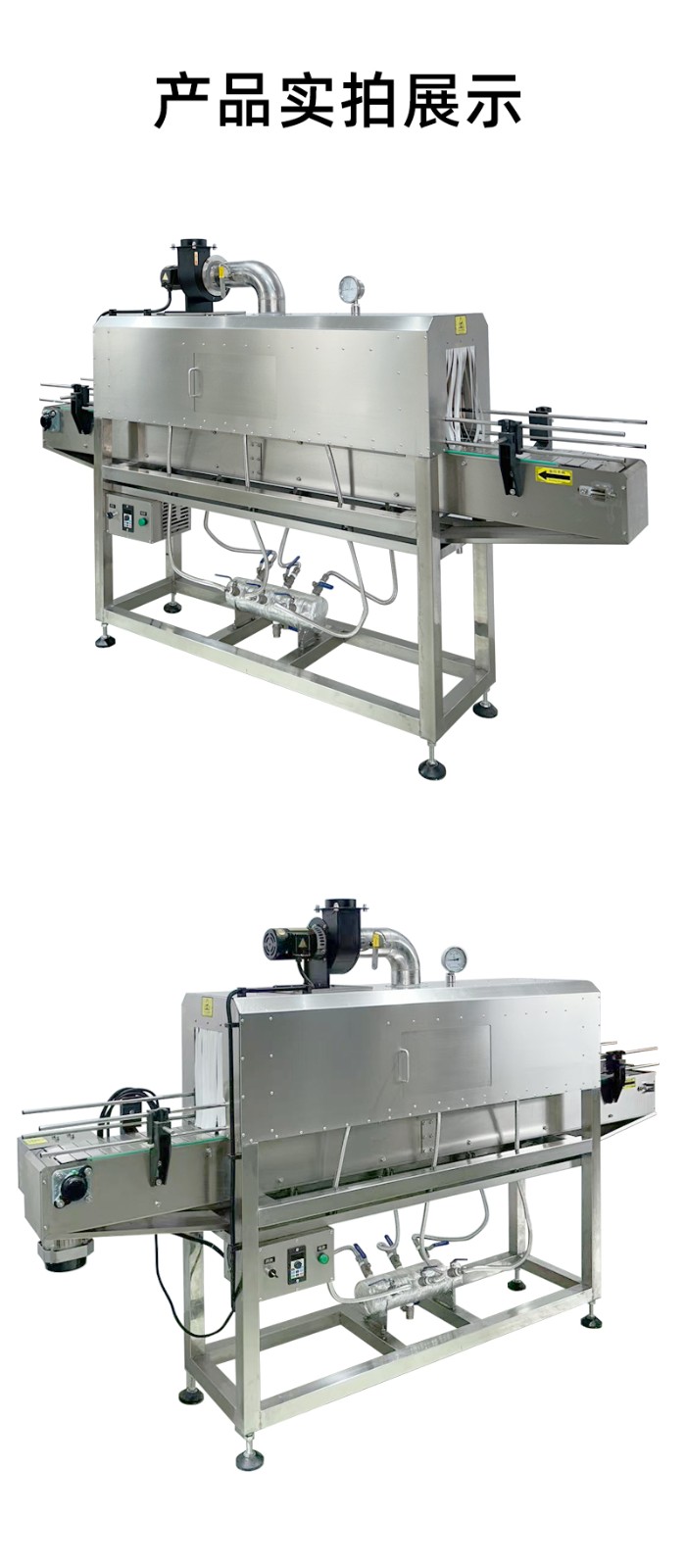 - 加熱效果優越:利用蒸汽恒溫且溫度擴散均勻的特性工作,能達到普通電熱紅外加熱收縮機不可比擬的效果。設備采用加熱器加熱水產生蒸汽,無需另外配備蒸汽鍋爐。主機有主副 2 個加熱器,可根據生產速度調節功率大小,輸送帶采用無級調速,輸送速度可任意調節。