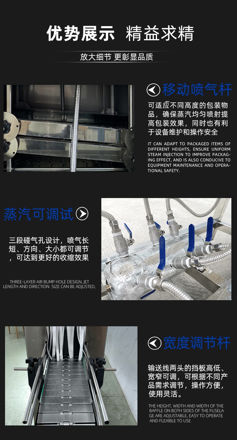 蒸汽收縮機的核心工作原理是利用蒸汽的均勻熱量,使熱收縮膜受熱后緊密包裹產品,最終完成密封定型的自動化包裝過程。