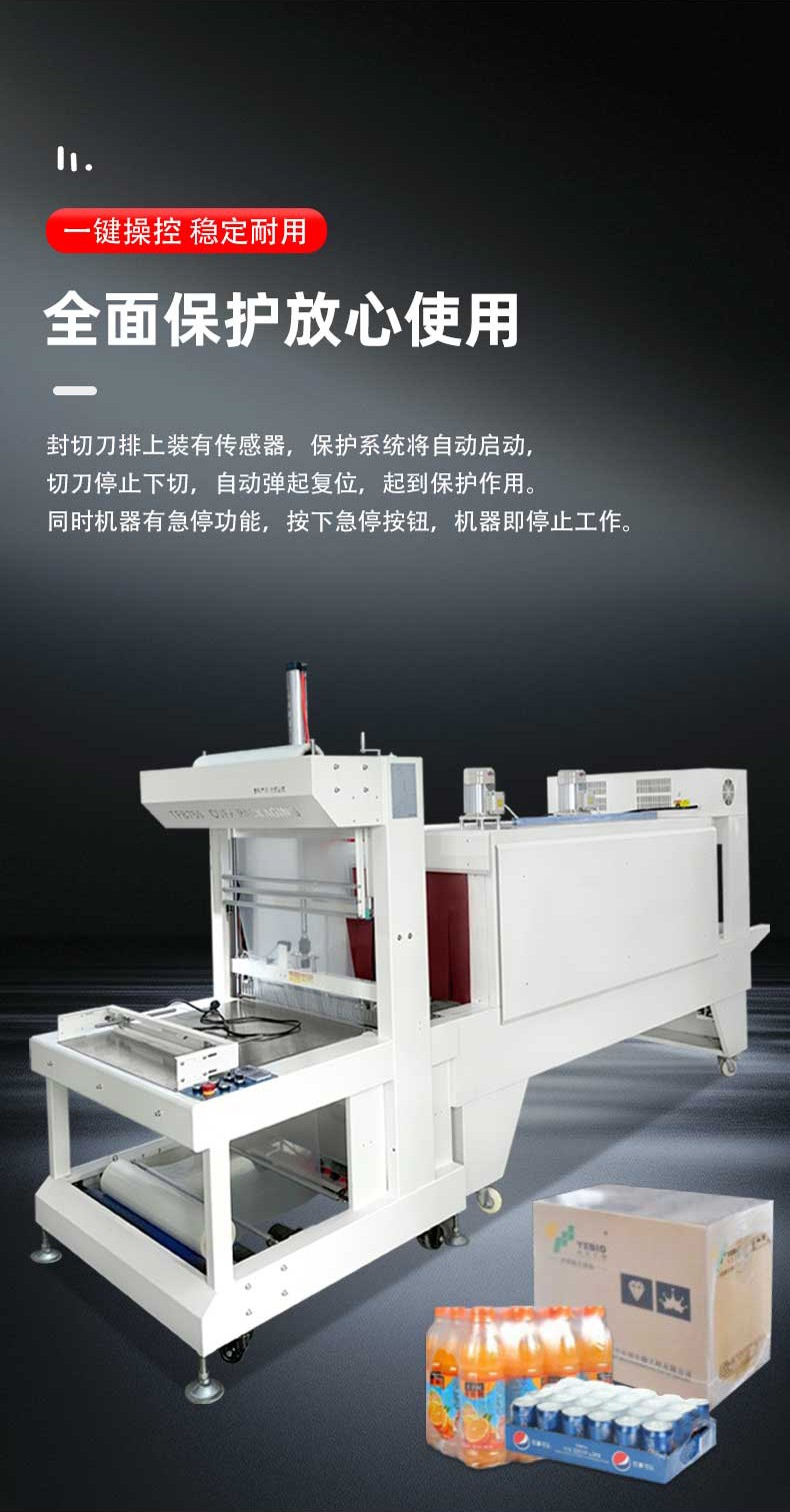 批量生產(chǎn)對設(shè)備的連續(xù)運(yùn)行能力要求極高,袖口式熱收縮包裝機(jī)通過三大設(shè)計(jì)確保穩(wěn)定性:其一,采用重型鋼結(jié)構(gòu)機(jī)身,搭配精密軸承與耐磨輸送帶,長期運(yùn)行后機(jī)身無明顯晃動,輸送帶磨損率降低 60%,使用壽命可達(dá) 3-5 年;其二,搭載進(jìn)口 PLC 控制系統(tǒng)與伺服電機(jī),核心部件故障率低于 0.3%,可支持 24 小時(shí)連續(xù)作業(yè),即使在食品飲料行業(yè) “旺季日產(chǎn) 10 萬瓶” 的高強(qiáng)度生產(chǎn)場景下,也能保持穩(wěn)定運(yùn)行;其三,配備完善的保護(hù)機(jī)制 —— 當(dāng)加熱管溫度異常、包裝膜斷膜、輸送帶卡瓶時(shí),設(shè)備會自動切斷電源或暫停運(yùn)行,并在觸控屏上顯示故障原因,操作人員可快速排查維修,平均停機(jī)維修時(shí)間控制在 15 分鐘以內(nèi),大幅減少因設(shè)備故障導(dǎo)致的產(chǎn)能損失。
