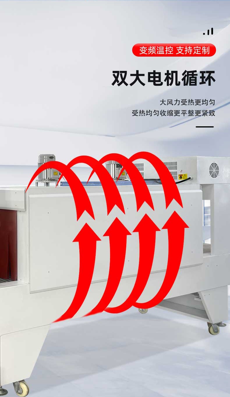 不同于傳統(tǒng)通用型包裝設(shè)備,袖口式熱收縮包裝機(jī)從設(shè)計(jì)源頭就瞄準(zhǔn) “瓶類產(chǎn)品組合包裝” 場景,徹底擺脫 “一機(jī)一用” 的局限。其針對瓶型包裝的特殊性,采用 “輸送帶 + 膜架 + 熱收縮通道” 的一體化結(jié)構(gòu):輸送帶可根據(jù)瓶身直徑、高度靈活調(diào)節(jié)寬度與輸送速度,無論是 500ml 的標(biāo)準(zhǔn)礦泉水瓶、1.2L 的果汁瓶,還是按壓式泵頭設(shè)計(jì)的洗手液瓶、帶提手的消毒液瓶,均能通過輸送帶平穩(wěn)輸送且不偏移;膜架部分配備自動張力控制系統(tǒng),可根據(jù)包裝膜厚度(常用 POF、PE 膜)精準(zhǔn)調(diào)節(jié)出膜力度,避免因膜張力不均導(dǎo)致的包裝褶皺或破損;熱收縮通道則采用分區(qū)加熱設(shè)計(jì),針對瓶身與組合間隙的不同熱收縮需求,實(shí)現(xiàn)均勻受熱,確保單瓶獨(dú)立包裝時(shí)膜面貼合瓶身,多瓶組合(如 2 瓶并排、4 瓶成箱、6 瓶堆疊)時(shí)膜體緊密包裹整體,杜絕 “局部收縮不到位” 的問題。