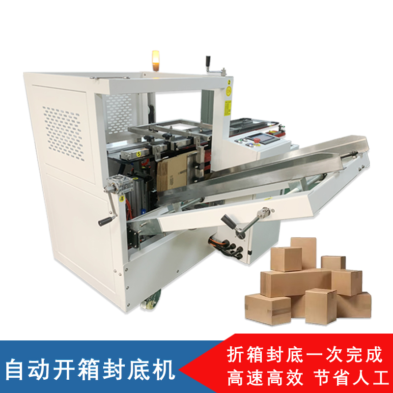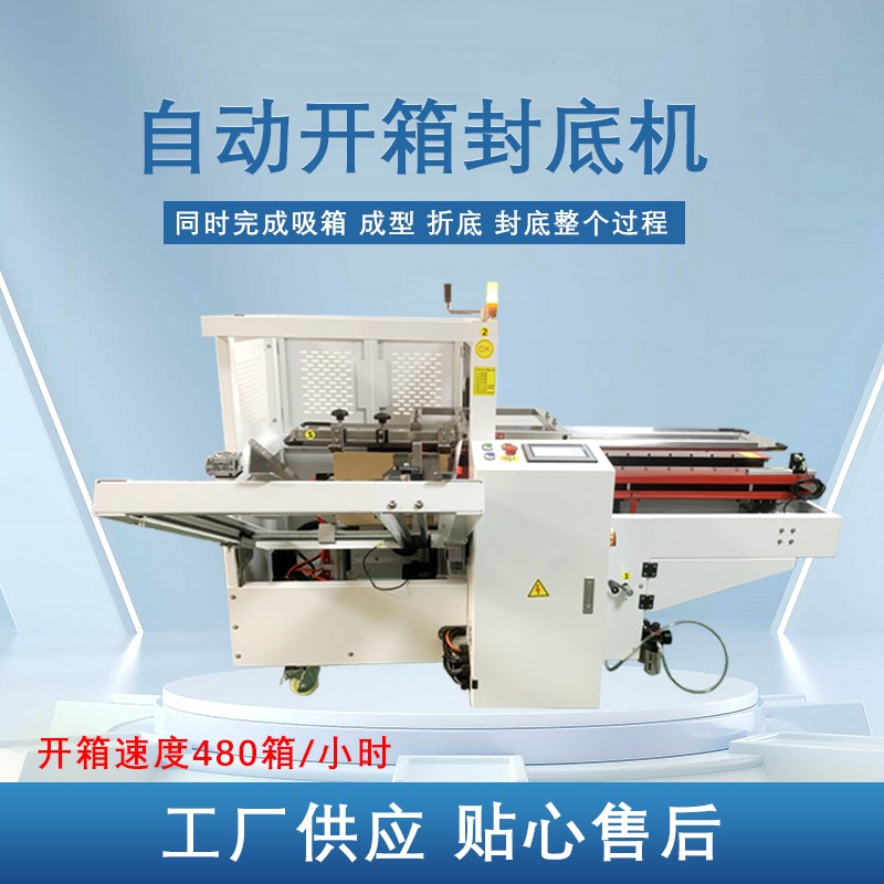 自動開箱封底機一次完成紙箱吸箱、開箱、成型、折底、封底等包裝工序,可大大減少生產人員和勞動強度。
