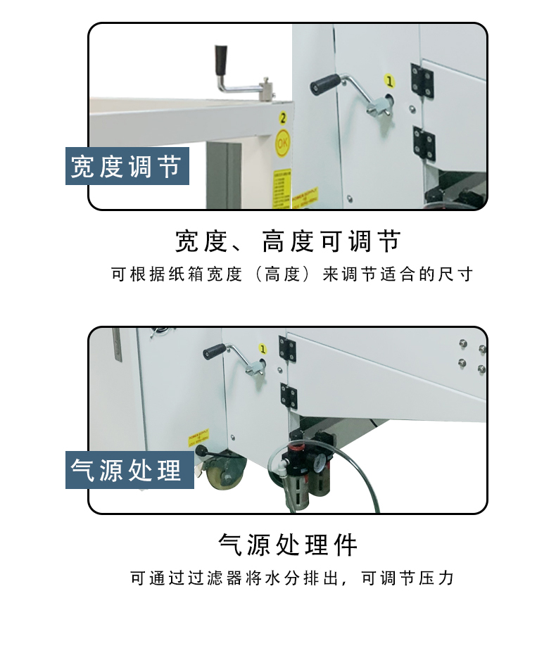 - 紙箱適應性強:適用紙箱范圍廣,不同大小紙箱調整簡便快捷,變換紙箱規格時,手動調整一般只需 1-2 分鐘。
