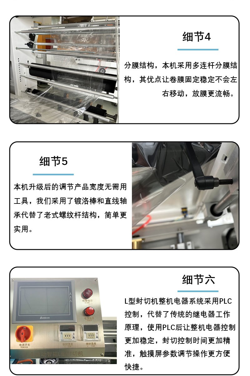 - 封切精度高,包裝成品率優異采用 PLC 可編程控制系統與伺服電機驅動,搭配光電感應定位技術,能精準識別產品尺寸,實現膜料的定長輸送與封切,封口線平整牢固,切口光滑無毛刺,有效避免因封切偏差導致的膜料浪費,成品率可達 99.5% 以上。同時,特制耐高溫鋁合金封刀具備防粘刀功能,適配 POF、PVC、PE 等多種熱收縮膜,杜絕膜料粘連封刀造成的包裝瑕疵。