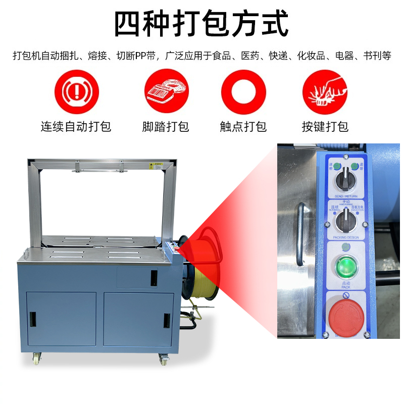 - 半自動打包機(jī):需要人工參與部分環(huán)節(jié),通常是人工將打包帶繞過物品,放置在打包機(jī)的特定位置,然后啟動機(jī)器,由機(jī)器完成收緊、封口和切斷等操作。