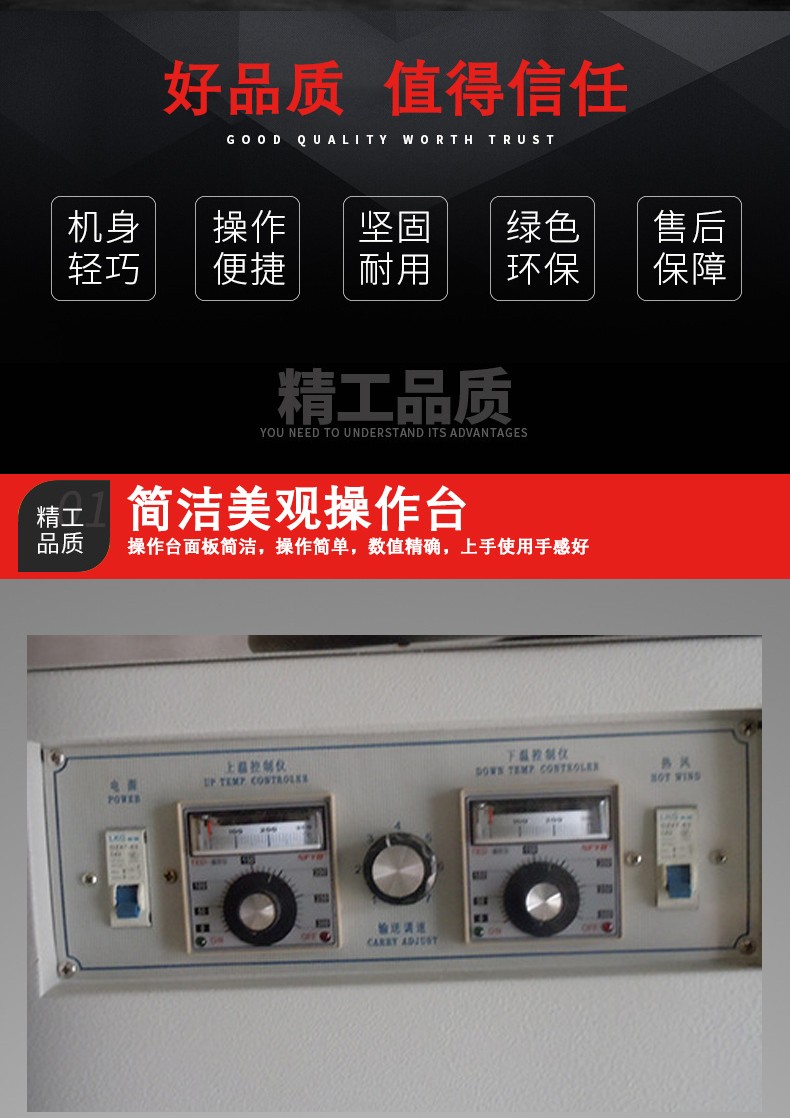 - 控制系統(tǒng):是設(shè)備的 “大腦”,可以對加熱溫度、輸送速度、噴氣強度等參數(shù)進行設(shè)置和控制。操作人員可以通過控制面板方便地操作機器,并且控制系統(tǒng)還具備溫度監(jiān)控和故障報警功能。例如,如果加熱溫度過高或過低,系統(tǒng)會發(fā)出警報并自動調(diào)整溫度;如果機器出現(xiàn)故障,如風(fēng)機故障或輸送帶卡頓,也會及時提示操作人員進行維修。