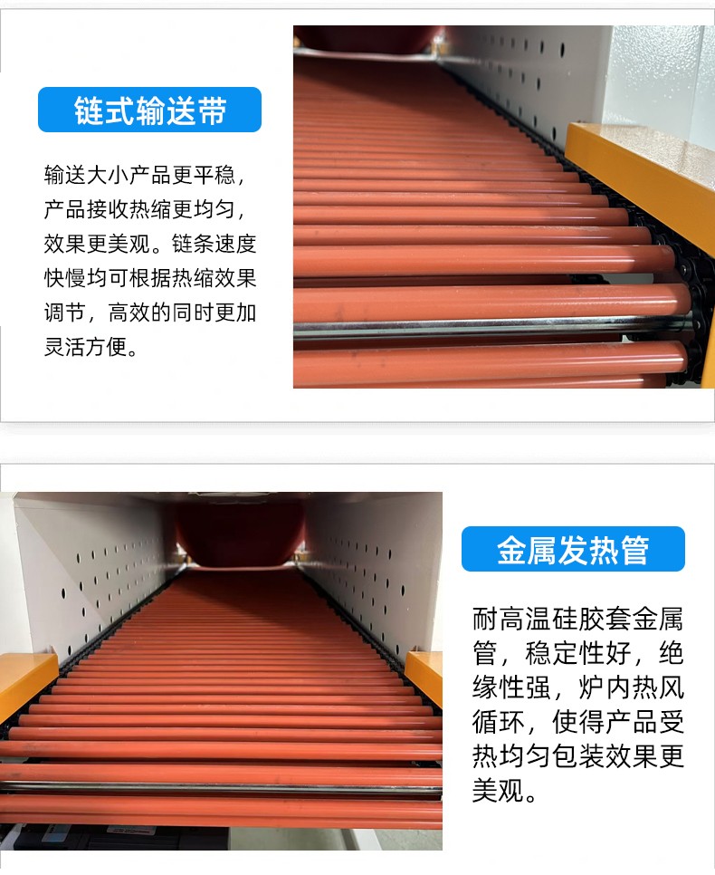 - 熱收縮效果佳:熱收縮通道內(nèi)的溫度分布均勻,熱風(fēng)循環(huán)系統(tǒng)設(shè)計(jì)合理,可使塑料薄膜均勻收縮,緊密貼合產(chǎn)品,展現(xiàn)產(chǎn)品的外觀特征,同時起到防潮、防塵、防碰撞等保護(hù)作用。