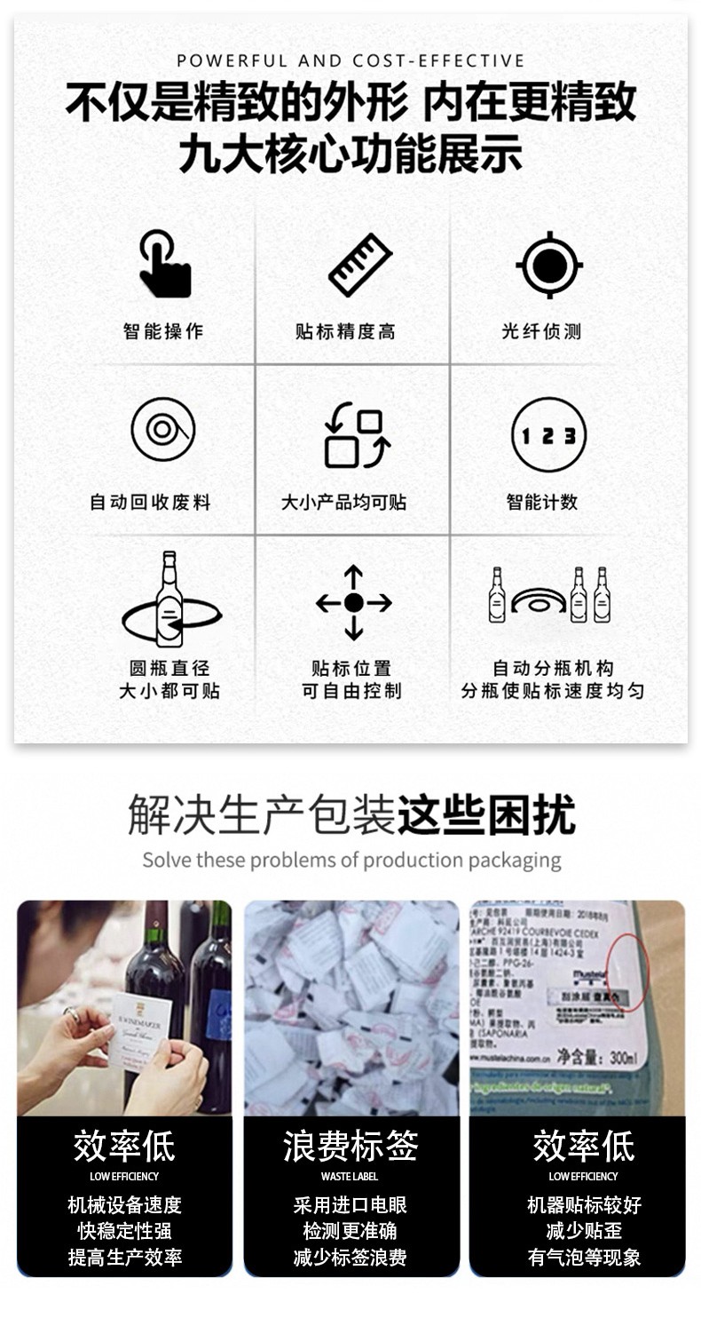 - 貼標:當圓瓶到達貼標位置時,貼標機構的標簽牽引裝置根據預設的標簽長度,將標簽從標簽卷上牽引出來,貼標頭在控制系統的指令下,將標簽準確地貼附在圓瓶表面。同時,壓標裝置對標簽進行壓實,使其牢固地粘貼在瓶身上。