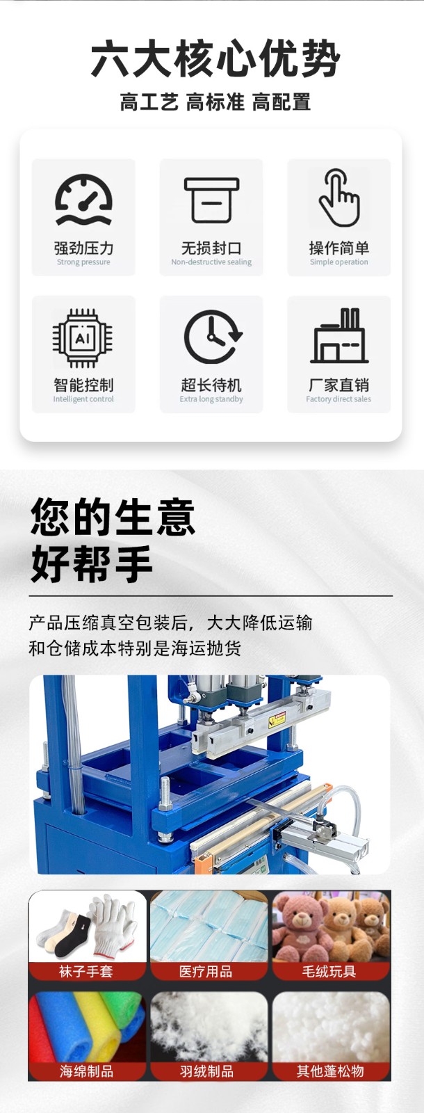 - 家居用品:用于羽絨被、棉被、枕頭、毛絨玩具等蓬松物品的收納包裝,可大大節省存儲空間,使家居環境更加整潔有序。