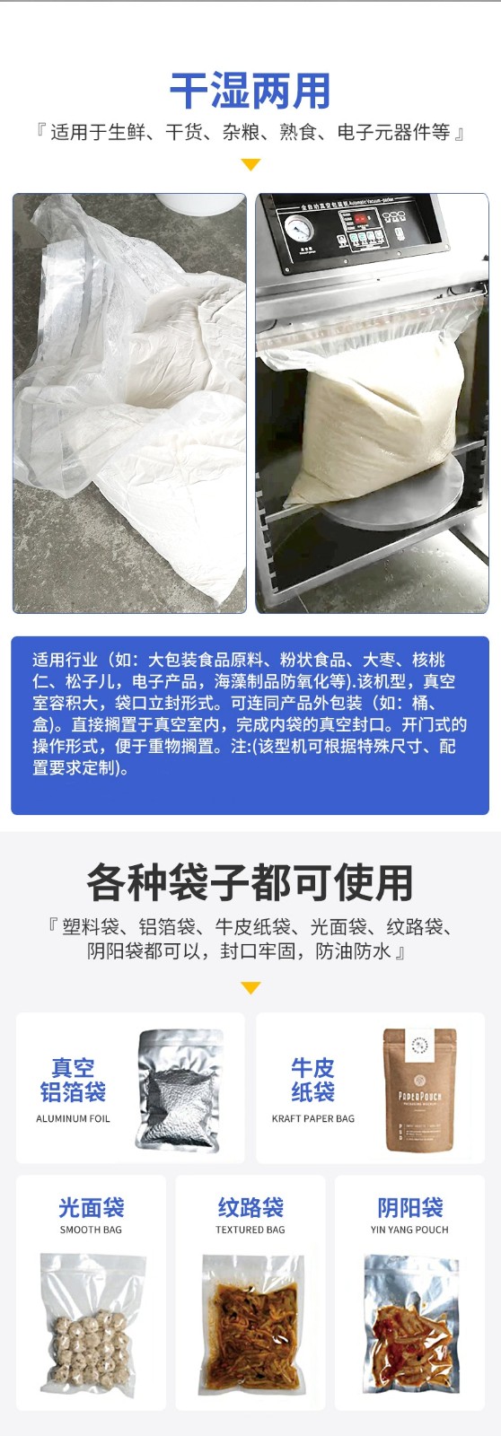 - 袋口立封形式:采用袋口立封的方式,可連同產(chǎn)品的外包裝,如桶、盒等,直接放置于真空室內(nèi),完成內(nèi)袋的真空封口,使包裝成品更加美觀59。