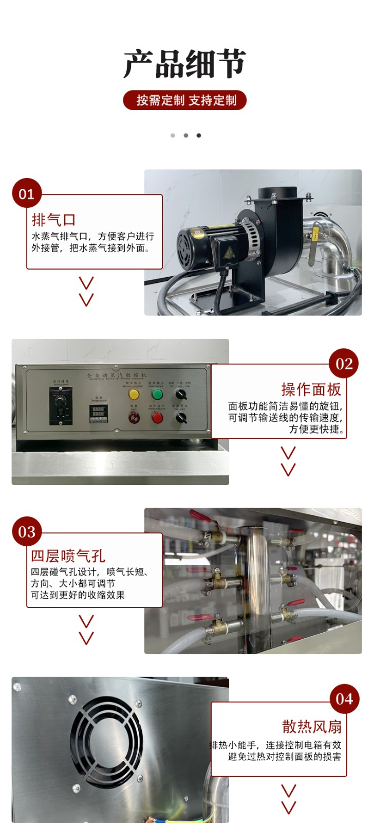 設備的結構設計圍繞 “蒸汽產生 - 加熱收縮 - 產品輸送 - 參數控制” 展開,核心部件包括四大模塊: