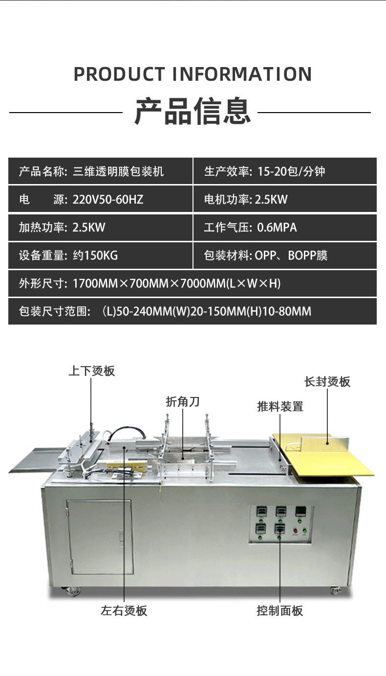 半自動三維包裝機(jī)(又稱半自動透明膜裹包機(jī)、半自動煙包機(jī))是醫(yī)藥、食品、日化、電子等行業(yè)中用于提升產(chǎn)品包裝檔次的核心設(shè)備,其核心是通過 BOPP 透明膜(或含鋁箔的復(fù)合膜)對產(chǎn)品進(jìn)行三維立體裹包,形成類似香煙盒外層的緊致、透明(或半透明)包裝,兼具防塵、防潮、防偽及外觀美化功能。其 “半自動” 特性主要體現(xiàn)在需人工輔助上料,后續(xù)核心包裝工序全自動完成,平衡了設(shè)備成本與包裝效率,適合中小批量或多規(guī)格產(chǎn)品的包裝需求。