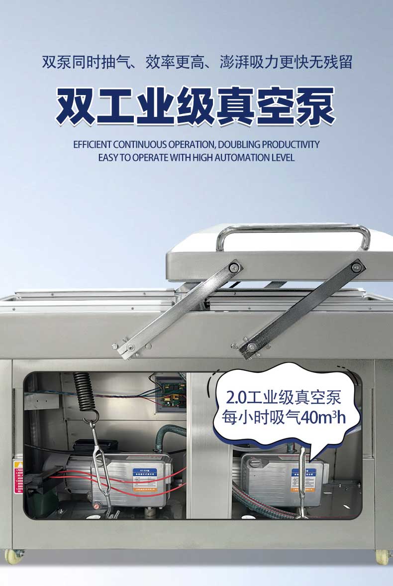 機身通體采用不銹鋼材質,耐腐防銹易清潔,適配食品車間潮濕作業環境,經久耐用。核心配置大功率真空泵,真空度可達 - 0.1MPa,抽氣速度快,能快速抽出包裝袋內空氣,有效抑制細菌滋生,延長產品保鮮期與儲運穩定性。